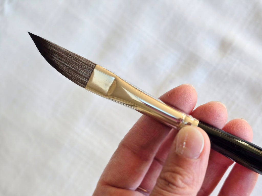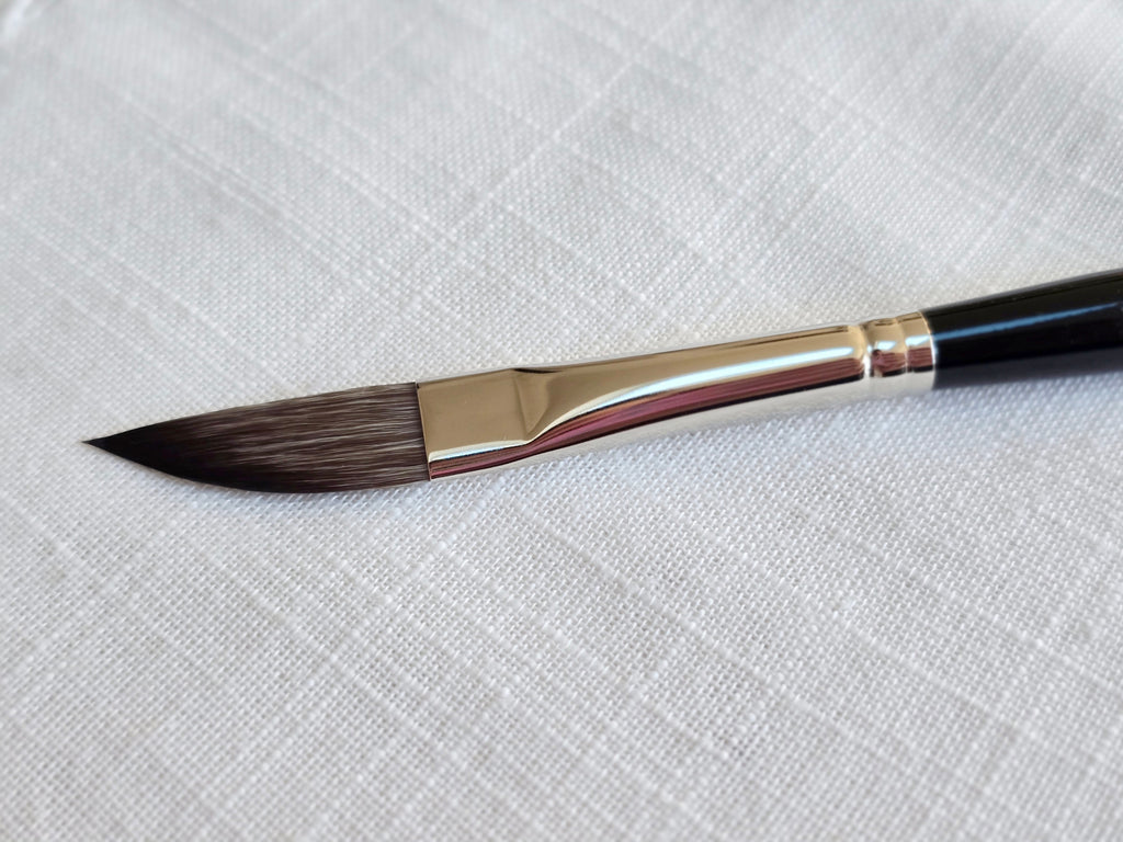 Pinceau forme épee en fibre synthétique imitation petit gris, avec un manche classique. Très bonne rétention.