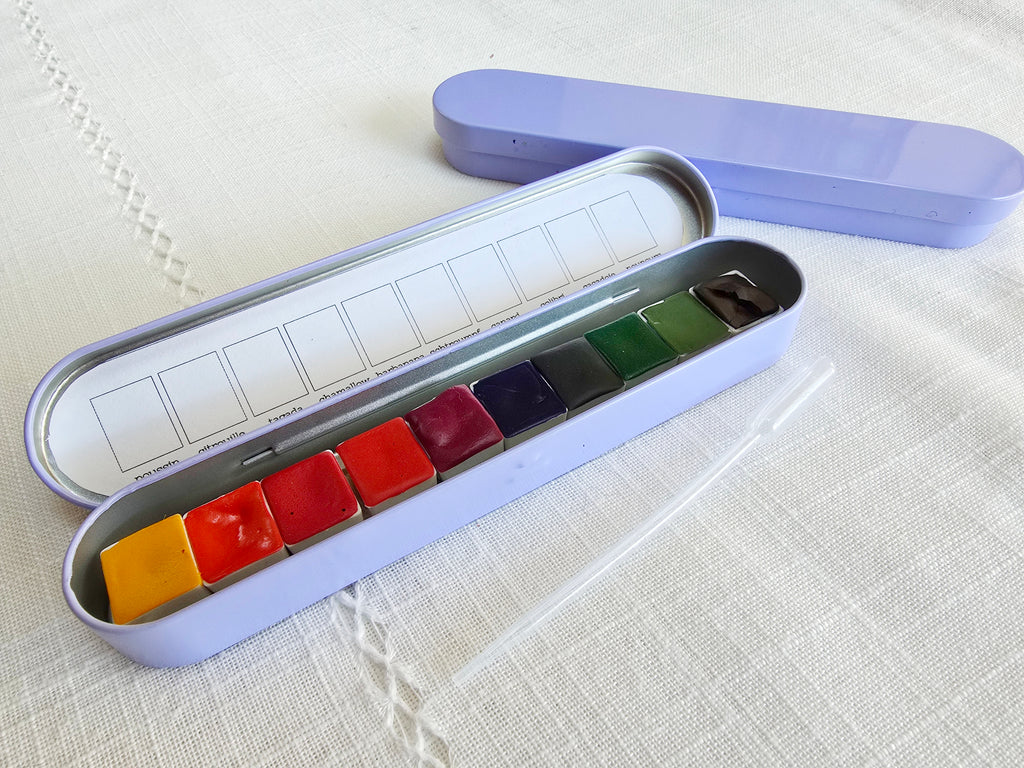 Elle est composée de 10 demi-godets d'aquarelle, avec des pigments soigneusement sélectionnés, sûrs pour la santé et l'environnement, présentée dans sa jolie boîte métallique. Vous y trouverez également une petite pipette en plastique qui servira à déposer une goutte d'eau sur les demi-godets afin de réactiver mes pigments comme les grands.