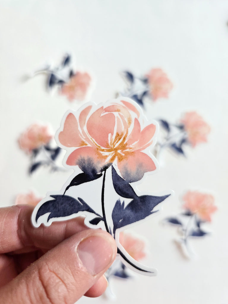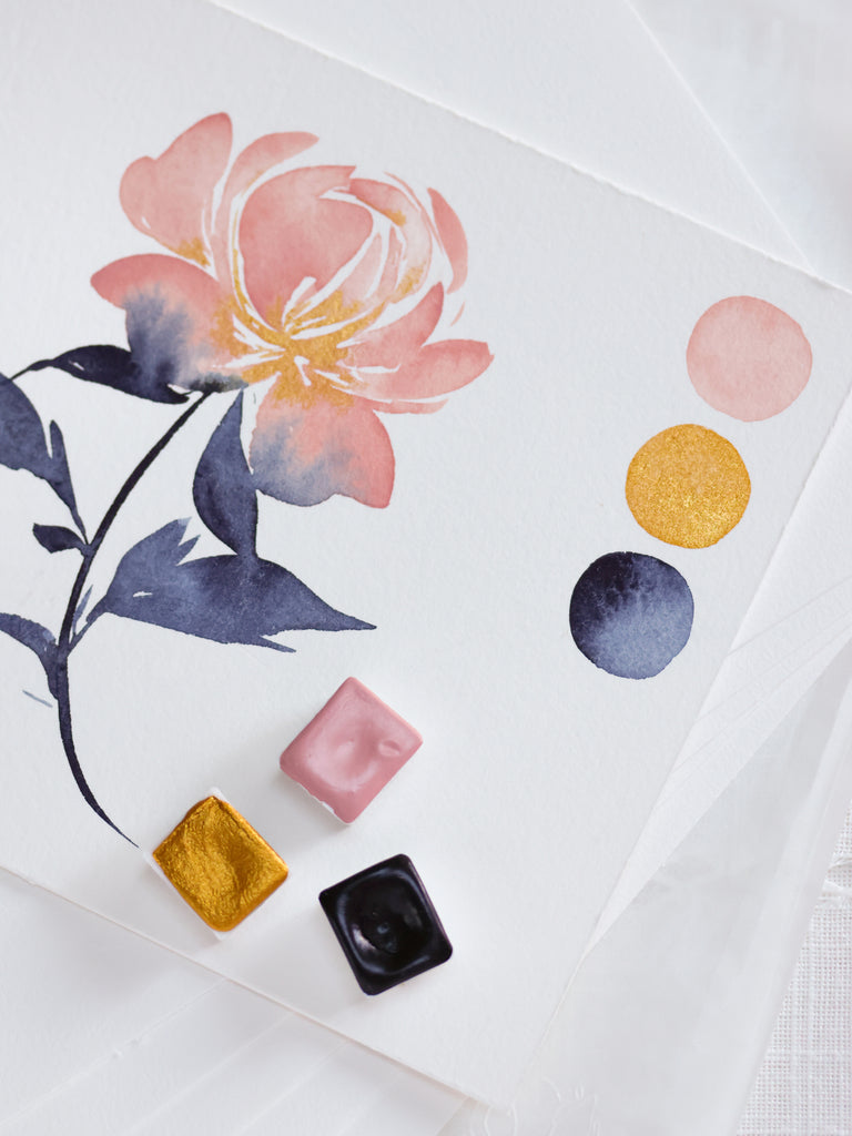Pour parfaire le set, vous y découvrirez 5 feuilles de papier aquarelle 100% coton Les Couleurs VF au format A5 (21x14,8cm), ainsi qu'un superbe sticker vinyl représentant une pivoine, peint avec les couleurs du set.